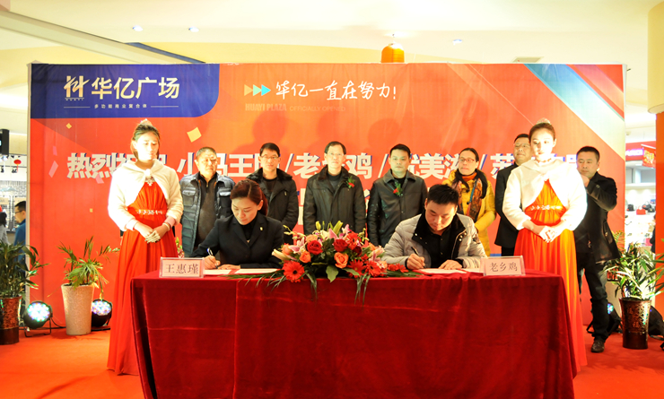 在全場嘉賓的熱烈掌聲中,華億國際總經理張樹華、副總經理張玲、繁昌華億國際常務副總經理王惠瑾、副總經理強磊分別與入駐品牌蘇寧云商、優美茲、老鄉雞、星光匯KTV進行簽約,標志著這些深受歡迎的品牌正式入駐繁昌華億廣場。