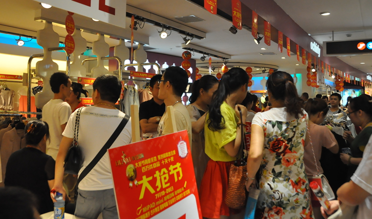 仿佛如昨,大搶節(jié)剛把江城裝扮成紅色與金色的海洋,人們便奔走呼告,一剎那婦孺皆知。2度來襲、10天10夜、100部IPADmini、300輛電動車、600張電影卡、百萬商品,盛夏7月,江城似乎沒有什么比大搶節(jié)更熱!
