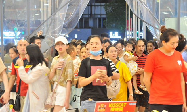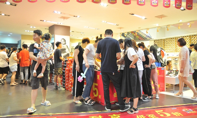 晚上7時,等候的人潮開始涌進商場,原本寬敞、靚麗的購物中心瞬間變得擁擠起來。放眼望去,商場通道內(nèi)擠滿了來回穿梭的消費者,各大專柜內(nèi)更是堆滿了琳瑯滿目的特價商品,人們幸福地挑選著商品,滿臉喜悅之情。