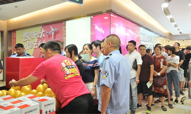 晚上6:30分,華億國際購物中心B座西門廣場客流不斷聚集,排隊等待入場,數(shù)名安保人員在門前維持秩序,玻璃門上掛著寫有“大搶節(jié)活動晚上7時開啟”字樣的KT板,提醒消費者正式進入商場的時間。熟悉活動的消費者都知道,這是華億國際“大搶節(jié)”活動開始前一小時進行閉門清場,這樣一個儀式感滿滿的活動設(shè)計從第一屆一直延續(xù)至今,成為“大搶節(jié)”活動的標簽之一。
