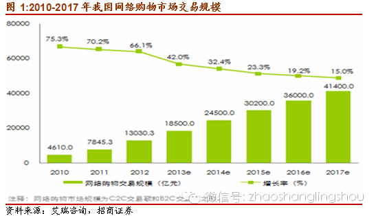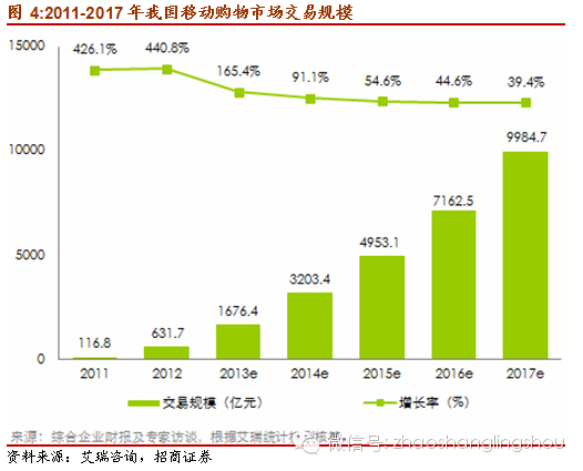 相對(duì)于傳統(tǒng)PC端網(wǎng)購,移動(dòng)網(wǎng)購門檻相更低,而且隨著移動(dòng)終端設(shè)備的普及和移動(dòng)網(wǎng)絡(luò)資費(fèi)價(jià)格的下降,移動(dòng)互聯(lián)網(wǎng)用戶逐漸拓寬到三四線城市和低收入人群,移動(dòng)網(wǎng)購正在電商企業(yè)物流配送觸及的范圍內(nèi)快速延伸。根據(jù)艾瑞統(tǒng)計(jì)數(shù)據(jù),2013年中國移動(dòng)網(wǎng)購滲透率9.1%,同比去年增長超過四個(gè)百分點(diǎn)。預(yù)計(jì)到2017年移動(dòng)購物滲透率達(dá)到24.1%。