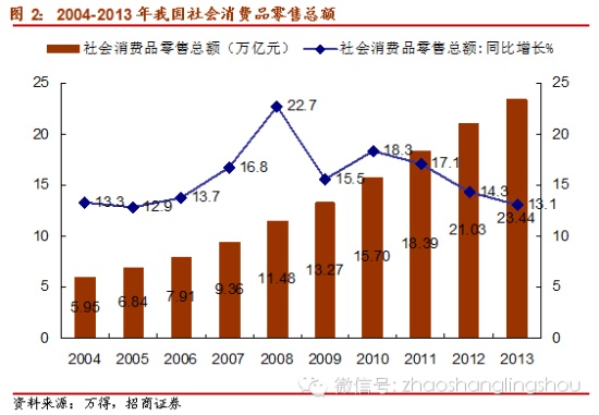 而與之形成鮮明對(duì)比的是社會(huì)消費(fèi)品零售總額的變化,13年我國社會(huì)消費(fèi)品零售總額23.44萬億元,同比增長13.1%,增速呈下滑趨勢(shì)。