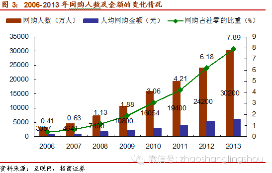 電商對(duì)于實(shí)體零售的沖擊已經(jīng)非常明顯,傳統(tǒng)零售商紛紛觸網(wǎng)來應(yīng)對(duì),截至2012年,國內(nèi)連鎖百強(qiáng)流通企業(yè)中已有62家開展了網(wǎng)絡(luò)零售業(yè)務(wù)。但網(wǎng)購占社會(huì)零售品總額的比率從2006年的0.41%到2013年的7.89%,網(wǎng)購人群從2006年的3357萬到2013年的3.02億,人均網(wǎng)購金額從2006年的929元到2013年的6125元。