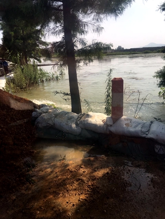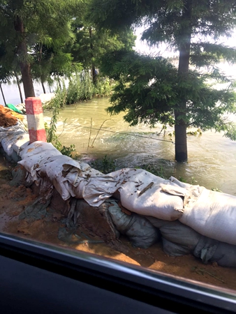 在去平鋪鎮的路途中,我們經歷了小小的波折,剛過漳河大橋不遠處,地勢低洼,路面積水約1米左右,救援車隊無法通行。無奈之下,我們選擇了鄉村小路繞過積水路段,原本狹窄的圩堤道路隨處可見圍堵洪水的沙袋和黃土堆,使得車輛通行變得十分困難,農田和圩區成了一望無際的“海洋”,讓我們切身體會到災情的嚴重,以及救災的困難程度。