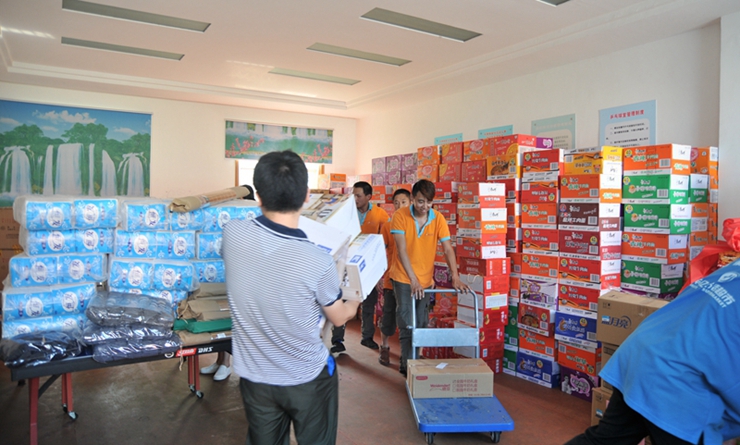 最終,經過兩個多小時的艱難行車,我們成功抵達平鋪鎮漳河大堤災區物資接收點,將一車棉被、手電筒、牛奶、衛生紙、礦泉水等災區緊缺物資安全送達工作人員的手中。